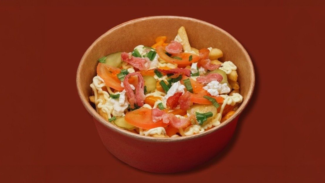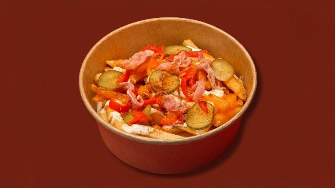 400g kraukšķīgu kartupeļu frī ar kausētu Čederas sieru, atsvaidzinošu gurķu mērci, marinētiem gurķiem, svaigiem tomātiem, fetas sieru, lociņiem un īpašu garšvielu maisījumu, papildināti ar kraukšķīgu bekonu.