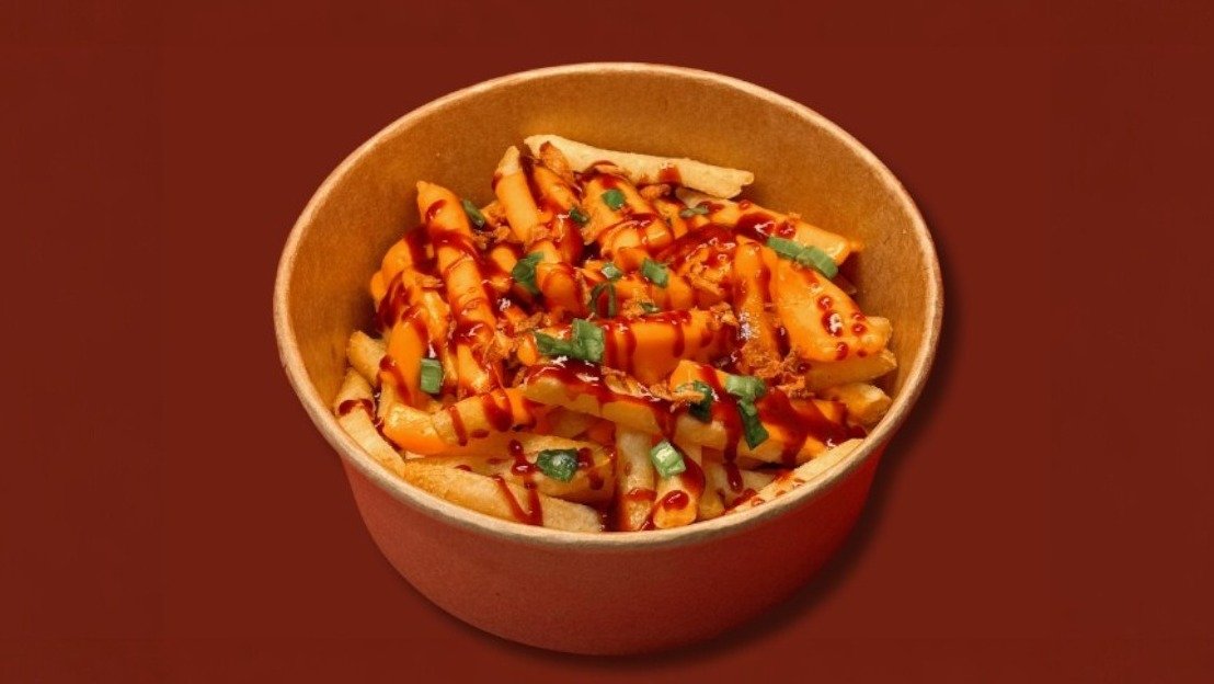 400g kraukšķīgu kartupeļu frī ar kausētu Čederas sieru, Čederas siera un paprikas mērci, garšīgām garšvielām, jalapeño pipariem, lociņiem un sulīgiem vistas gabaliņiem.