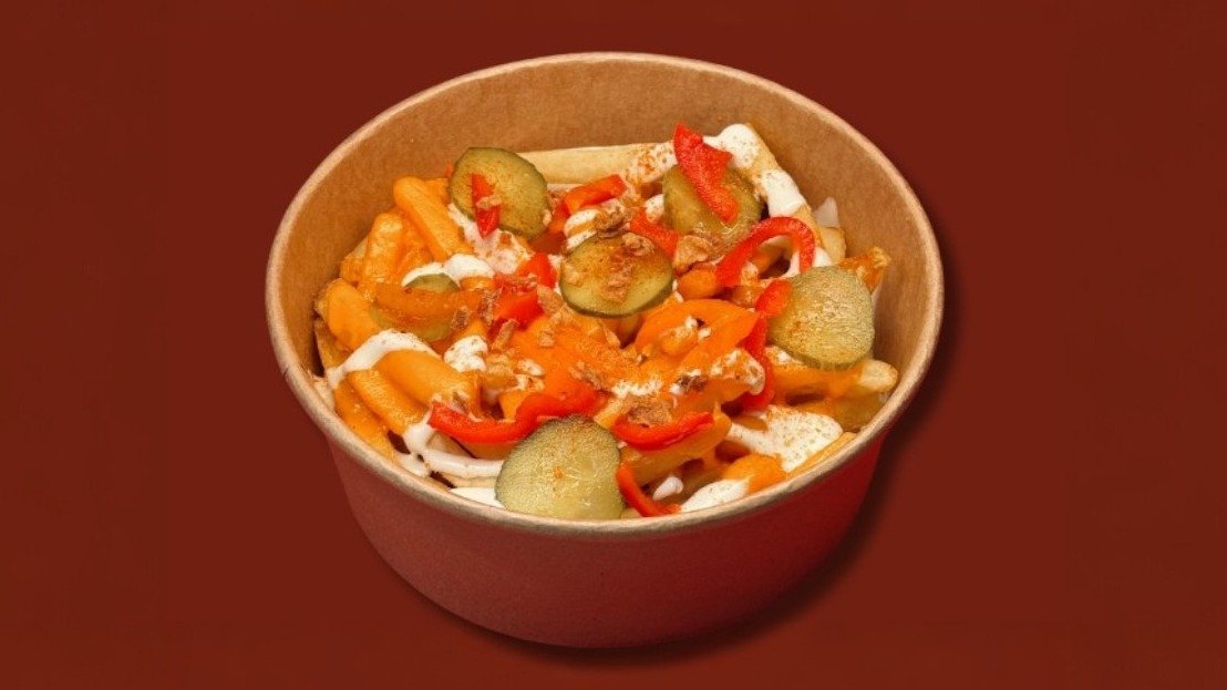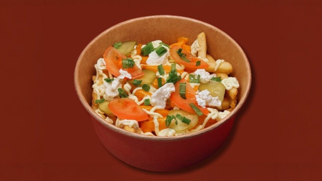 400g kraukšķīgu kartupeļu frī ar kausētu Čederas sieru, atsvaidzinošu gurķu mērci, marinētiem gurķiem, svaigiem tomātiem, fetas sieru, lociņiem un īpašu garšvielu maisījumu, papildināti ar sulīgiem vistas gabaliņiem.
