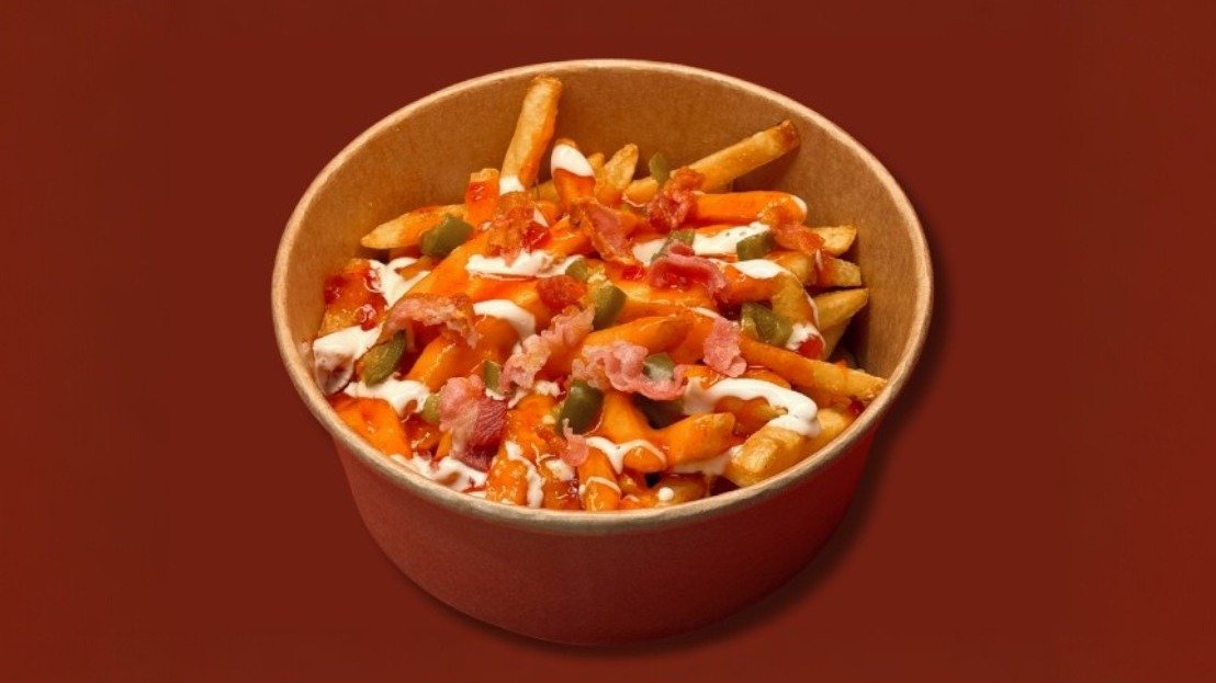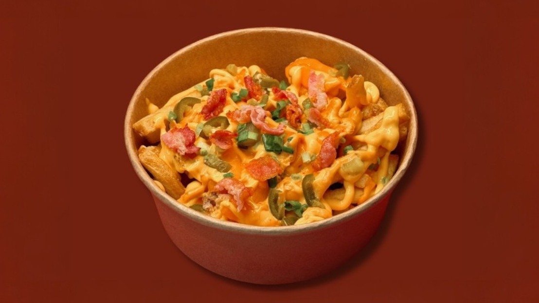 400g kraukšķīgu kartupeļu frī ar kausētu Čederas sieru, saldo čilli mērci, ķiploku mērci, īpašām garšvielām, jalapeño, papildināti ar kraukšķīgu bekonu.