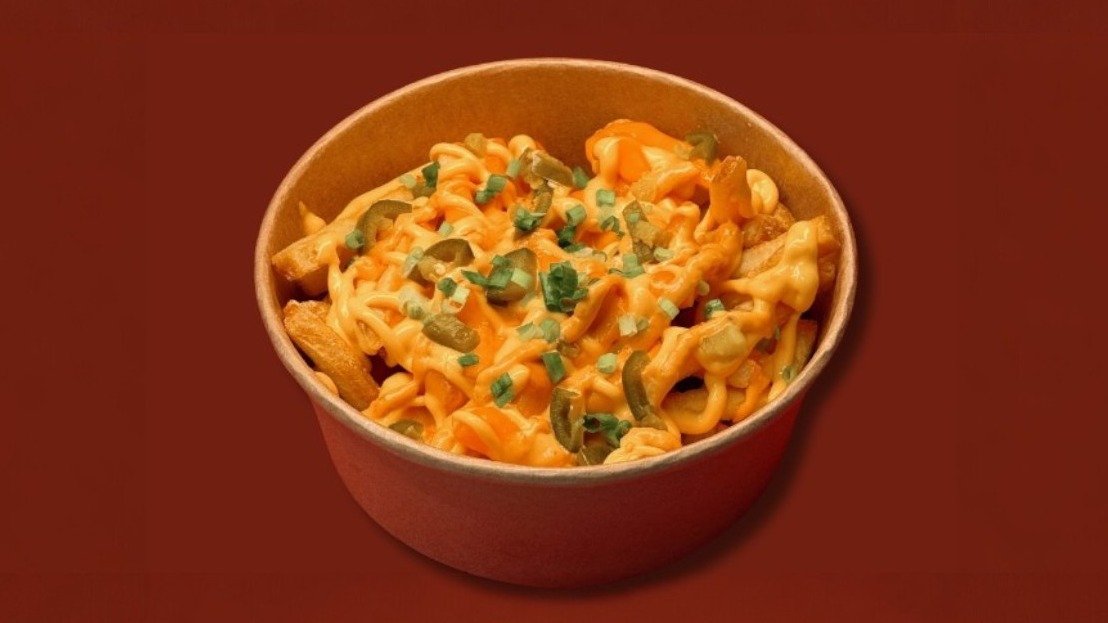 400g kraukšķīgu kartupeļu frī ar kausētu Čederas sieru, Čederas siera un paprikas mērci, garšīgām garšvielām, jalapeño pipariem un lociņiem.