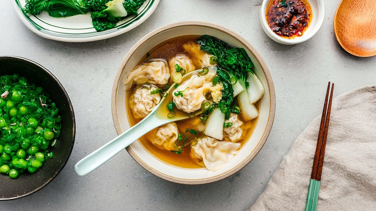 Tvaicēti pelmeņi, pildīti ar dārzeņiem un garšaugiem, pasniegti ar karstu ingvera - ķiploku zupu / Steamed dumplings filled with seasoned minced vegetables and herbs. Served with a hot ginger garlic soup