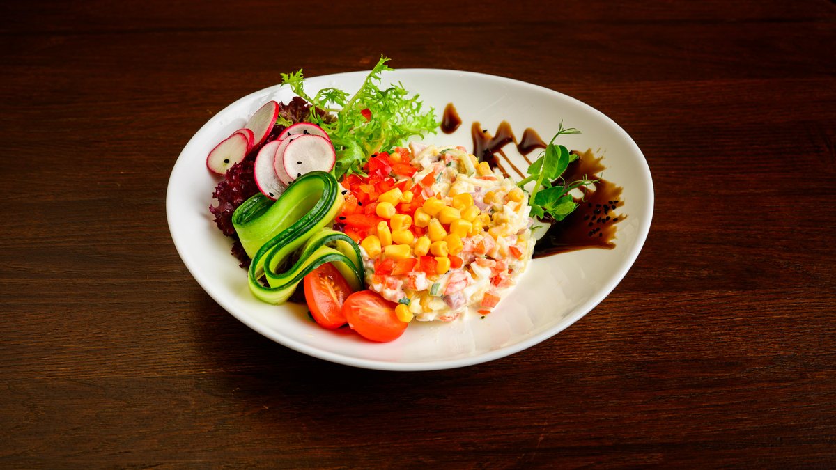 Unikāli salāti "Dvīņi" ar žāvētu gaļu, svaigu gurķi un papriku.