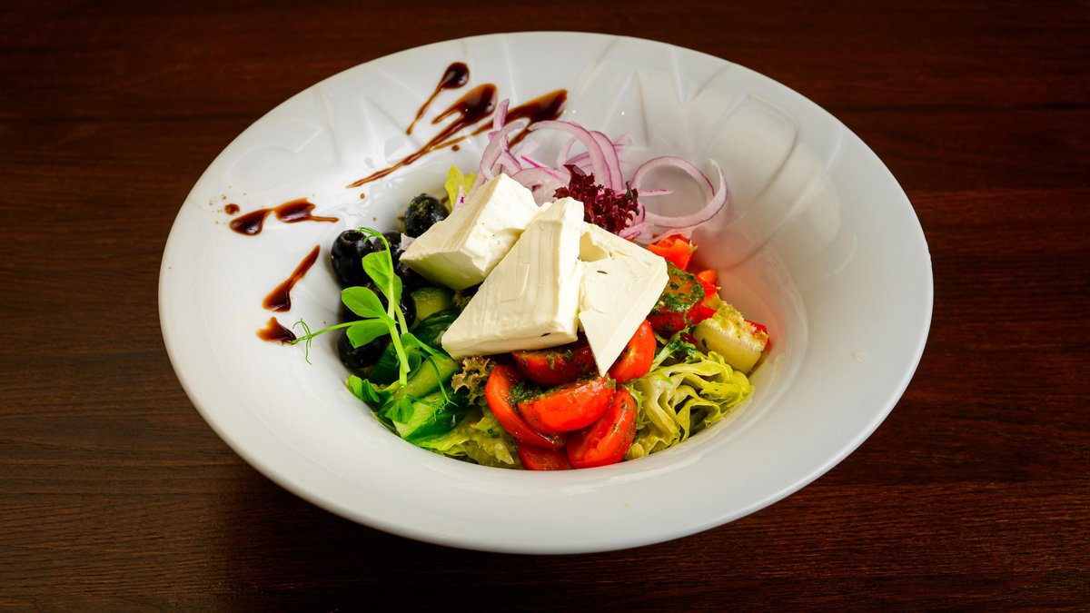 Tradicionāli grieķu salāti ar svaigiem dārzeņiem, olīvām un fetas sieru.