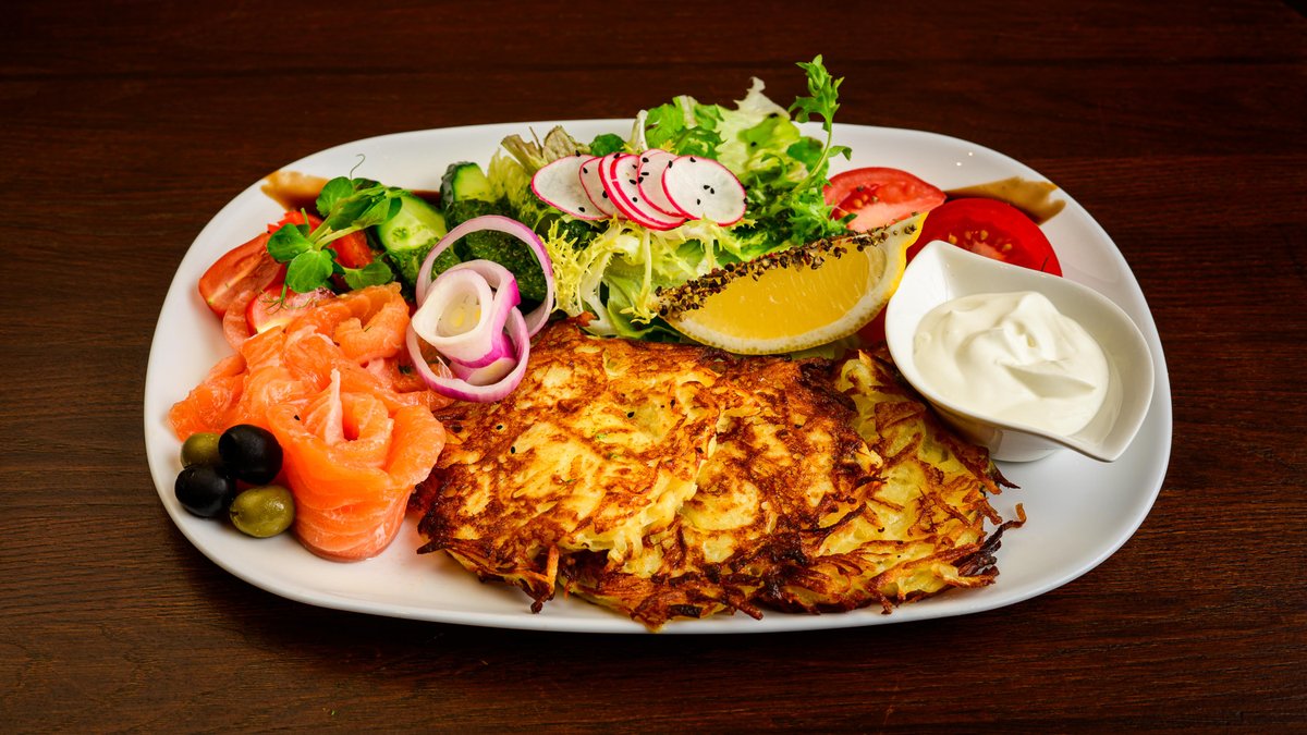 Kartupeļu pankūkas ar mazsālītu lasi un dārzeņiem
