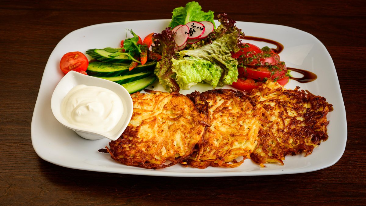 Sāļas kartupeļu pankūkas, pasniegtas ar skābo krējumu un svaigiem dārzeņiem.