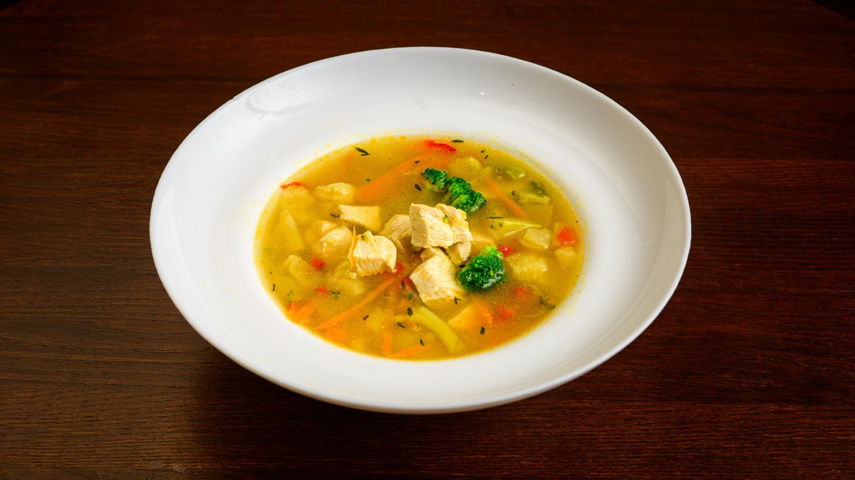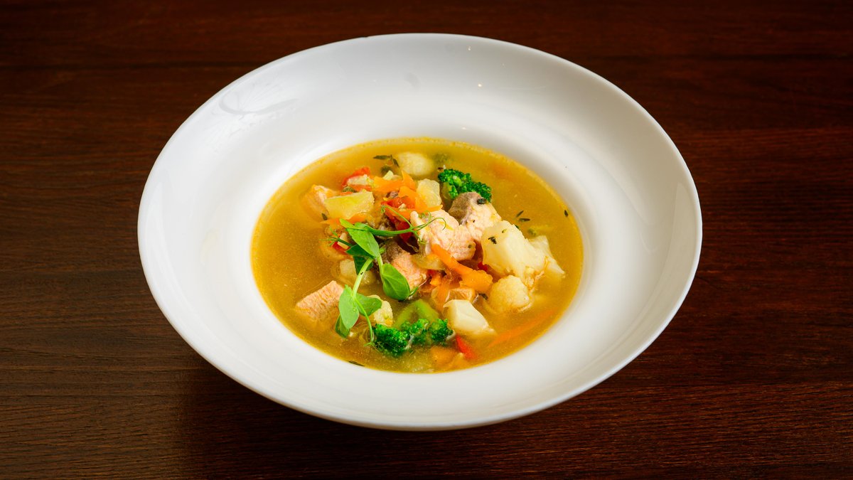 Viegls vistas buljona zupa, pildīta ar svaigiem sezonas dārzeņiem.