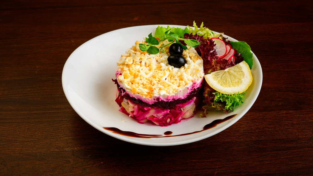 Kārtaini salāti, kas pazīstami kā "Siļķe kažokā".
