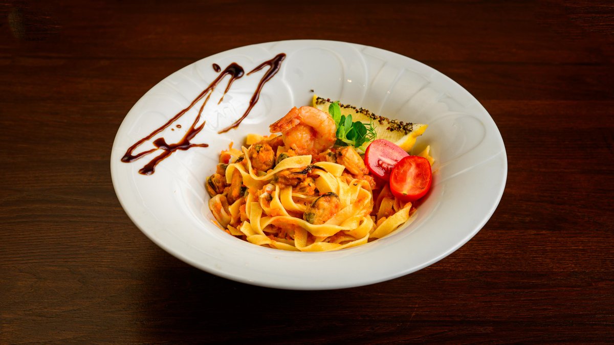 Tagliatelle pasta, sajaukta ar gardu jūras velšu maisījumu.