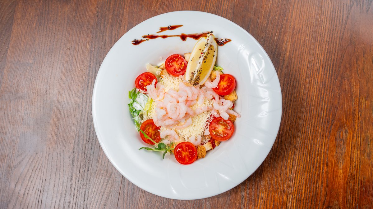 Klasiski Cēzara salāti ar sulīgām garnelēm.