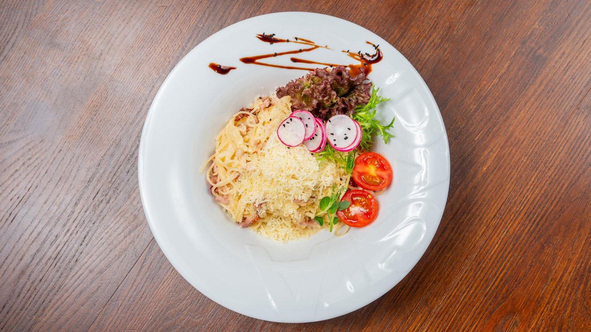 Klasiskie Spaghetti Carbonara ar bagātīgu, krēmīgu mērci.