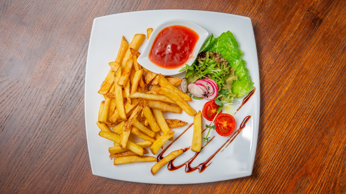 Zeltaini frī kartupeļi, pasniegti ar majonēzi vai kečupu pēc izvēles. - Attēls ir ilustratīvs un produkts var atšķirties no attēlā redzamā.