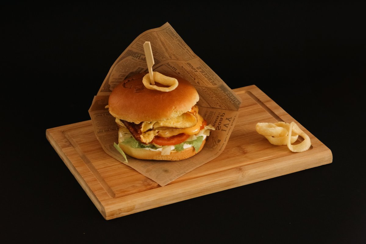 /LIELLOPA GAĻAS KOTLETE, ČEDARAS SIERS, BEKONS, TOMĀTS, MARINĒTS GURĶI, LEDUS SALĀTI, BBQ MĒRCE, MARINĒTI SĪPOLI, GURĶU MĒRCE/