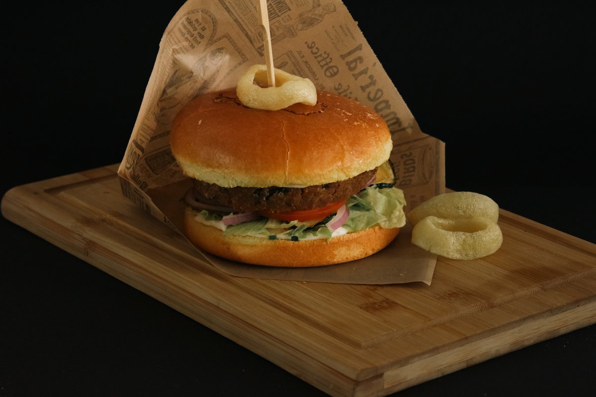 /LIELLOPA GAĻAS KOTLETE, ČEDARAS SIERS, TOMĀTS, MARINĒTS GURĶIS, KARAMELIZĒTI SĪPOLI, LEDUS SALĀTI, GURĶU MĒRCE/