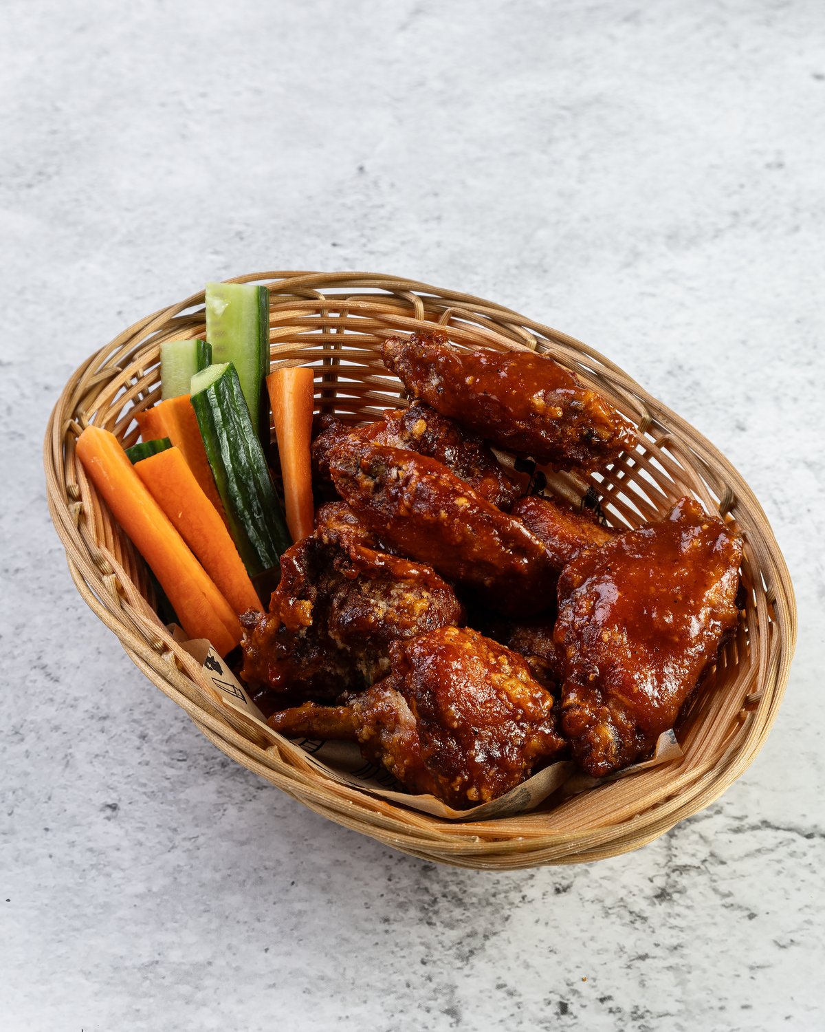 Pikantie vistu spārniņi sviesta-medus bbq mērcē ar svaigiem burkāniem un gurķiem