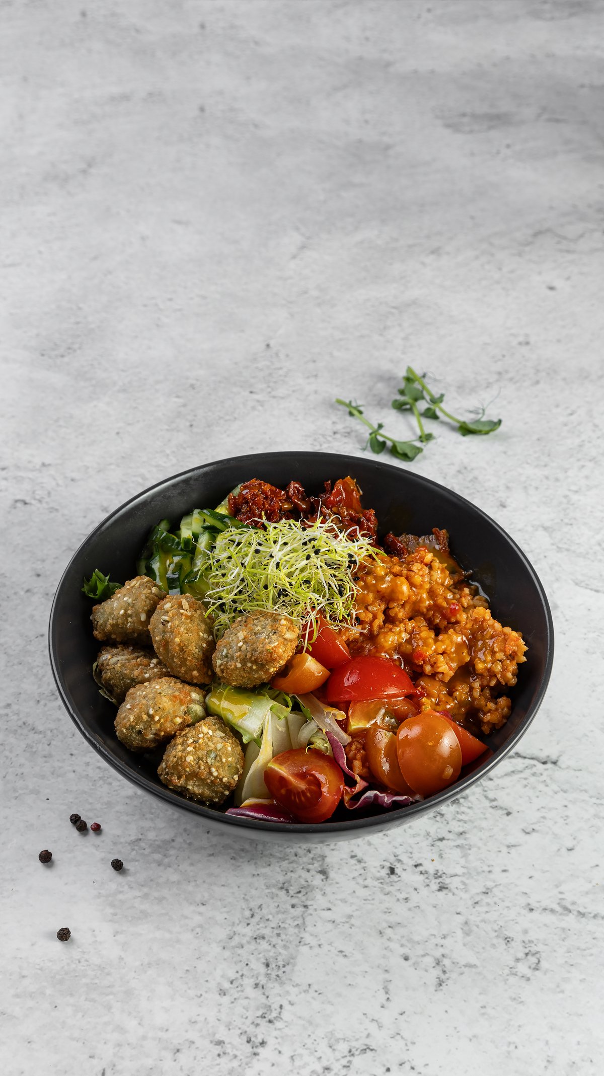 Bulgura salāti ar falafelu, saulē kaltētiem tomātiem un salātu mērci