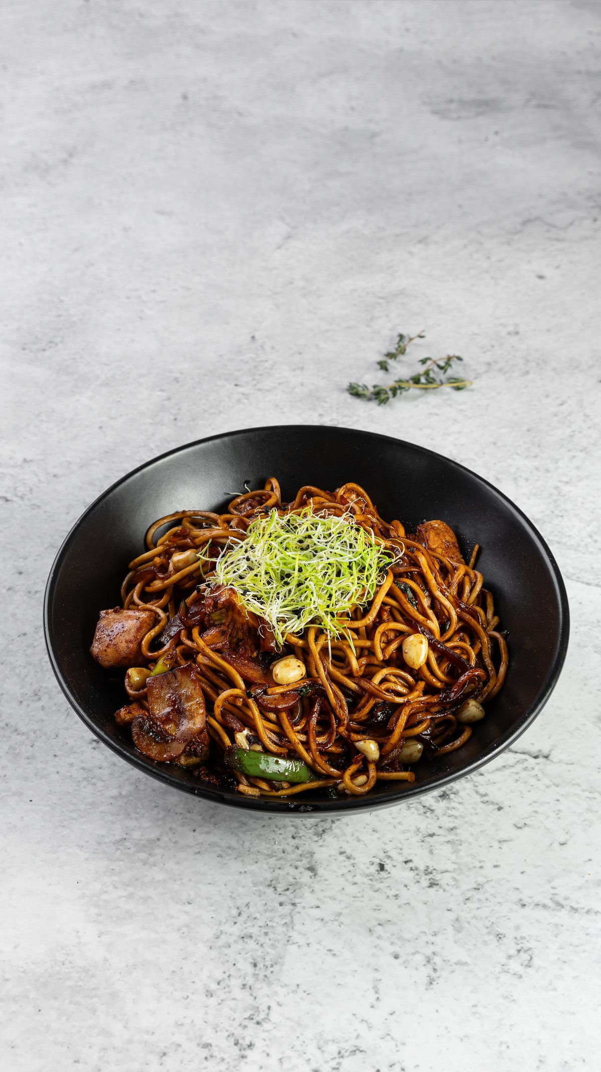 Olu nūdeļu voks ar vistu, papriku, šampinjoniem un zemesriekstiem
