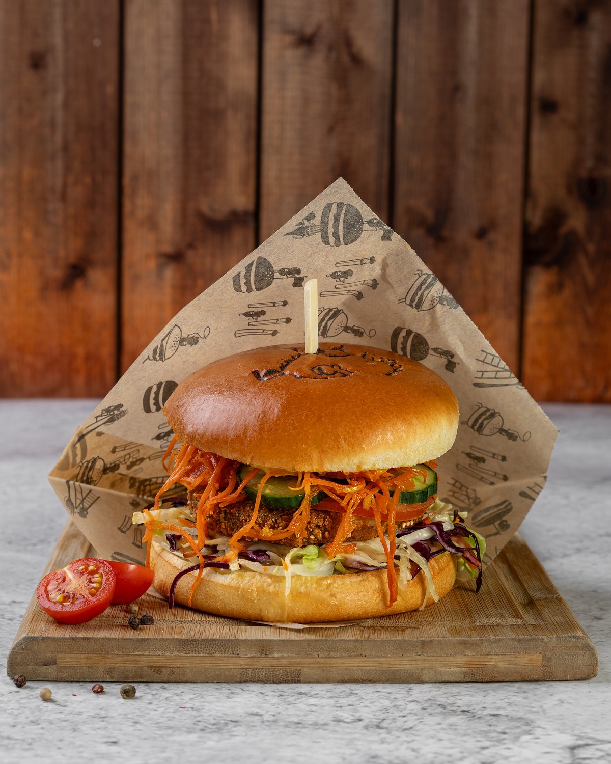 /TĪĢERGARNEĻU-SIERA KOTLETE, SVAIGS GURĶIS, TOMĀTS, LEDUS SALĀTI, KOREJAS BURKĀNI, SALDSKĀBĀ ČILI UN CITRONU-ZAĻUMU MĒRCES/