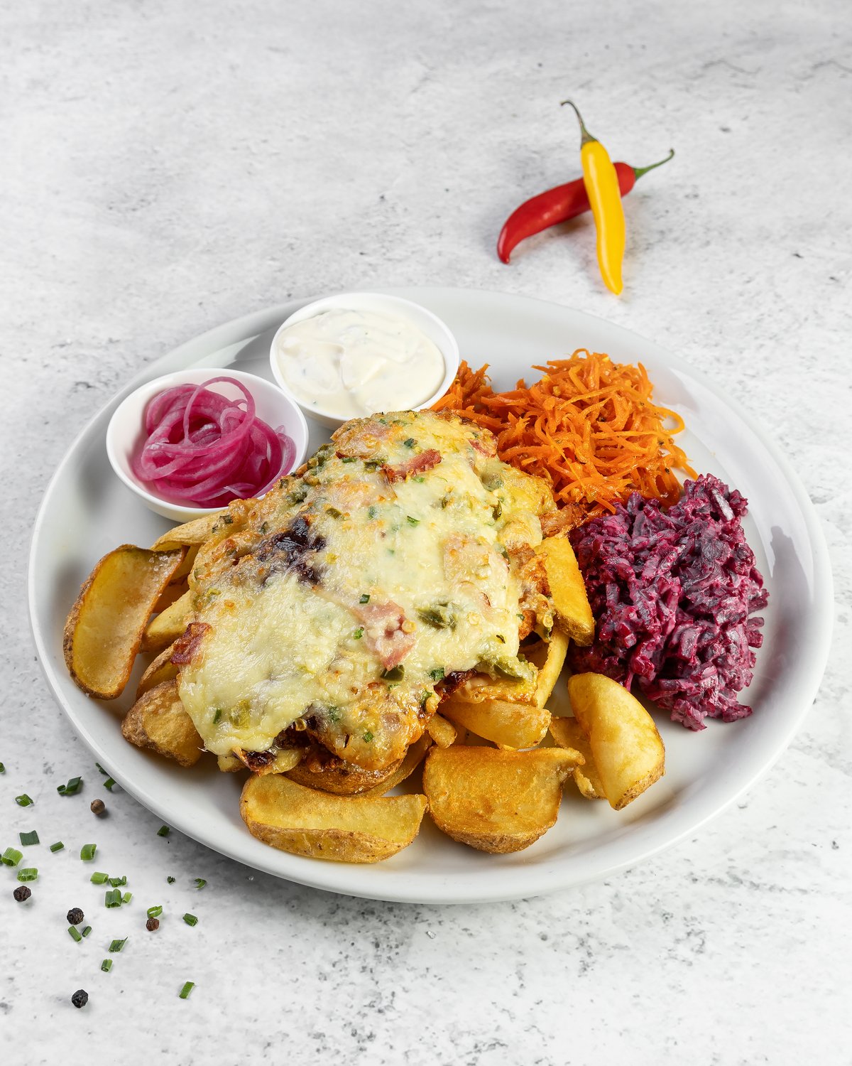 Pikantā cūkgaļas karbonāde ar bekonu, "grip&dip" frī, biešu salātiem, Korejas burkāniem, marinētiem sīpoliem un ķiploku - zaļumu mērci