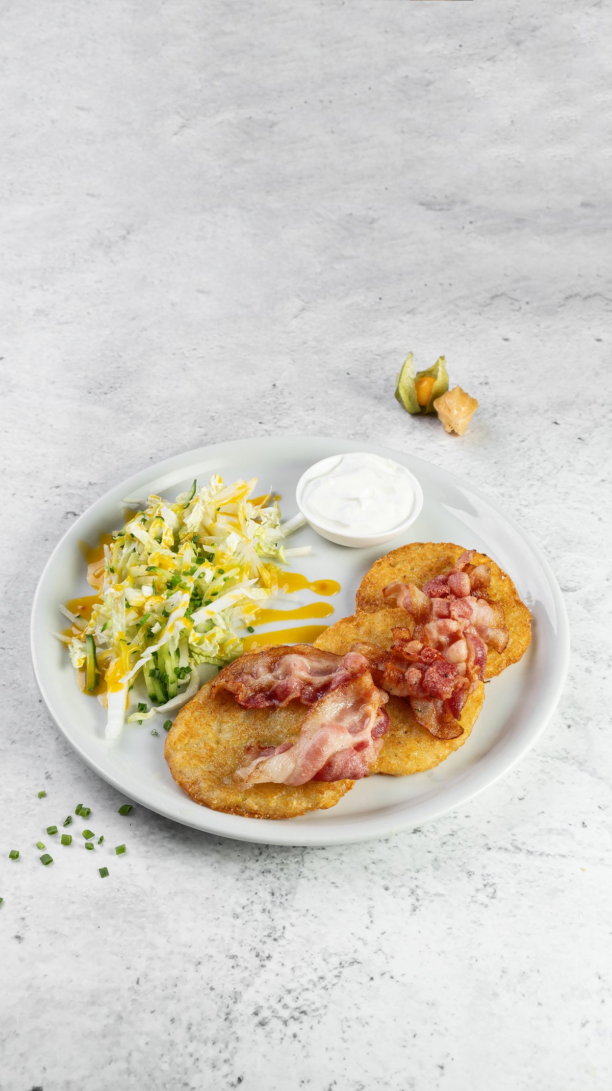/KARTUPEĻU PANKŪKAS, ČEDARAS SIERS, OLU KULTENIS, TOMĀTS, LEDUS SALĀTI, ĶIPLOKU-ZAĻUMU MĒRCE/