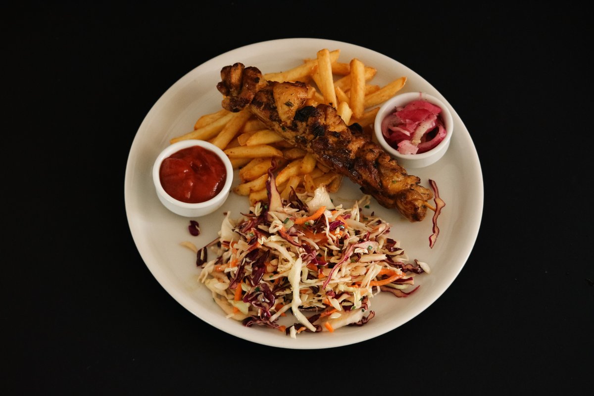 Vistas gaļas šašliks ar frī kartupeļiem, marinētiem sīpoliem un coleslaw salātiem