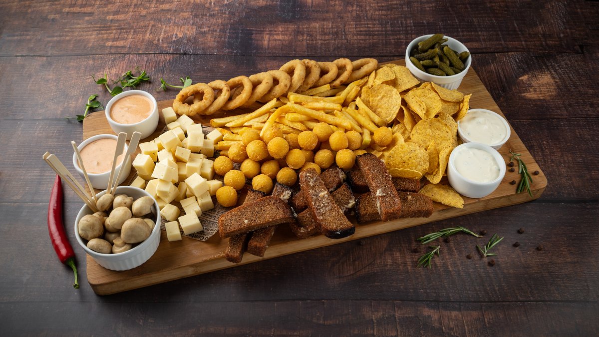 /KUKURŪZAS ČIPSI, ĶIPLOKU GRAUZDIŅI, SĪPOLU GREDZENI, MARINĒTI ŠAMPINJONI, PIPARGURĶĪŠI, FRĪ KARTUPEĻI, KARTUPEĻU BUMBIŅAS, SIERS, ĶIPLOKU-ZAĻUMU MĒRCE, ČILI MAJONĒZE/