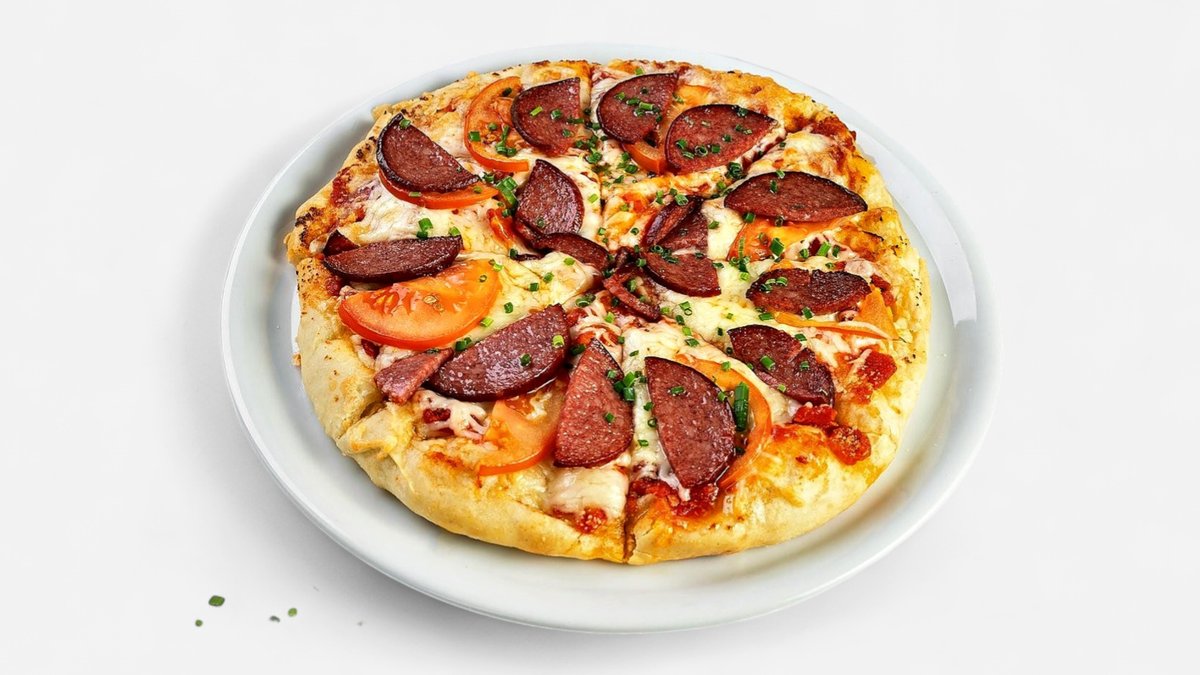 Klasiska picas pamatne ar aromātisku picu mērci, blendētiem ķiplokiem un oregano, bagātīgi pārklāta ar rīvētu sieru, salami, svaigiem tomātiem un dekorēta ar svaigiem maurlokiem Alergēni: 1,6,7