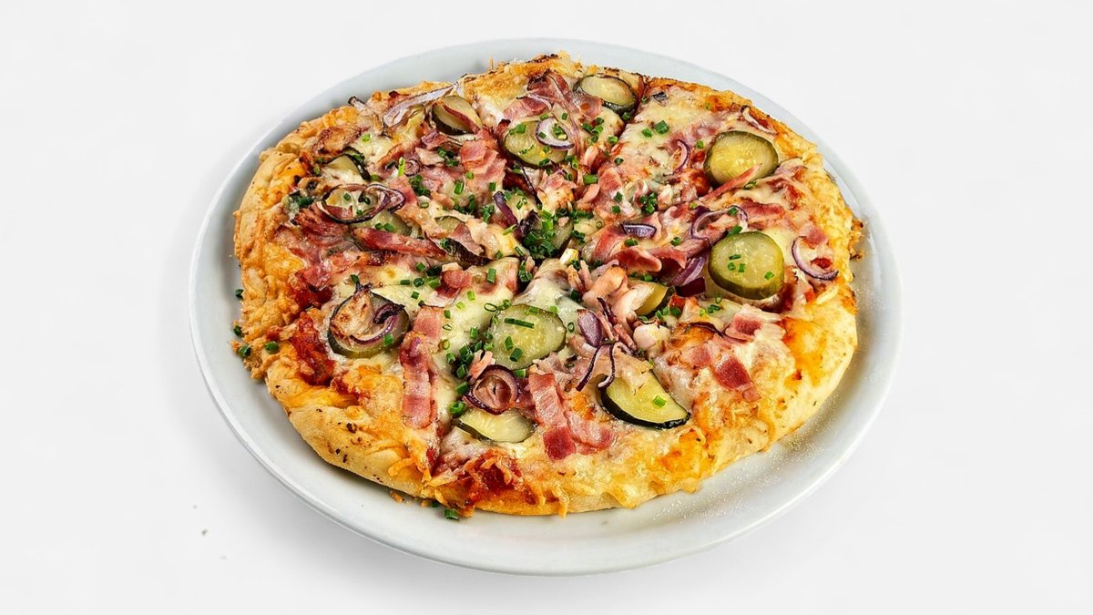 Klasiska picas pamatne ar aromātisku picu mērci, blendētiem ķiplokiem un oregano, bagātīgi pārklāta ar rīvētu sieru, bekonu, zilajiem sīpoliem un marinētiem gurķiem, dekorēta ar svaigiem maurlokiem Alergēni: 1,7
