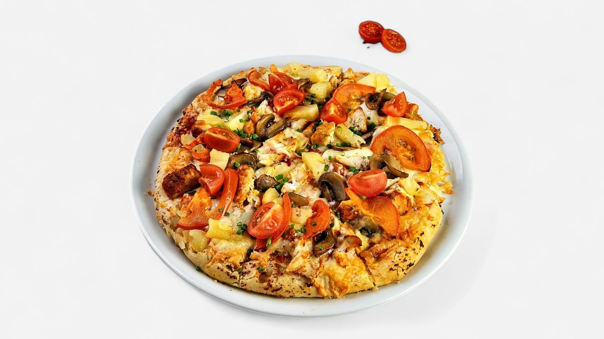 Klasiska picas pamatne ar aromātisku picu mērci, ķiplokiem un oregano, bagātīgi pārklāta ar rīvētu sieru, sulīgu ceptu vistas fileju, ceptām sēnēm, saldiem ananāsiem, svaigiem maurlokiem un ķiršu tomātiem Alergēni: 1,6,7,9