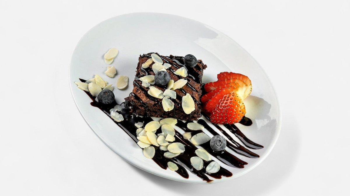 Šokolādes - mandeļu braunijs ar ogām un šokolādes mērci