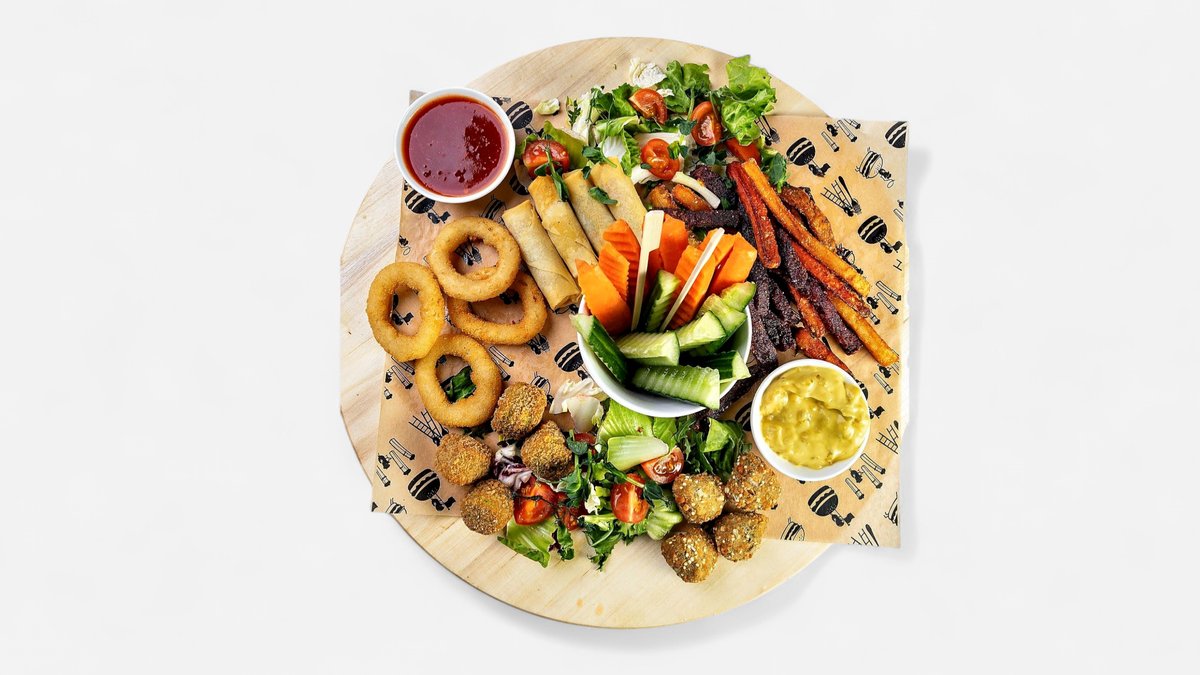 "Popkorna" vistiņas, grisīni, lavašs ar vistu, vistas spārniņi, kalmāru gredzeni, ķiršu tomāti, marinēti gurķi, springrolls, saldo kartupeļi fri, BBQ, ķiploku -zaļumu un čedaras siera mērces