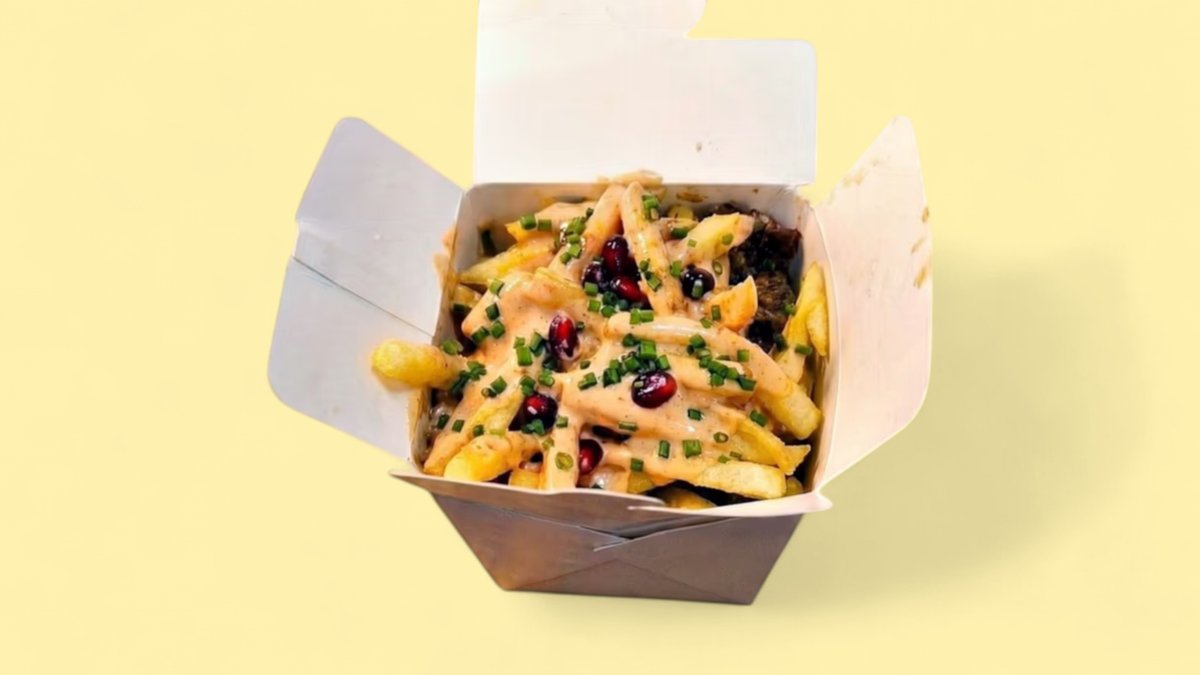 Ērts un sātīgs boksijs. Gaļa un frī vienā traukā, dekorēti ar granātābolu graudiņiem un svaigiem lociņiem.