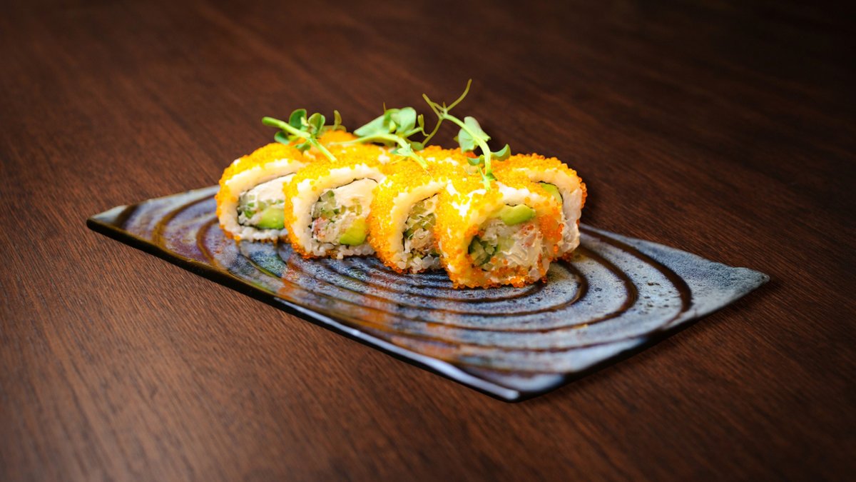 Rīsi, philadelphia siers, gurķis, avokado, krabju gaļa, masago ikri, ingvers, vasabi, mikrozaļumi