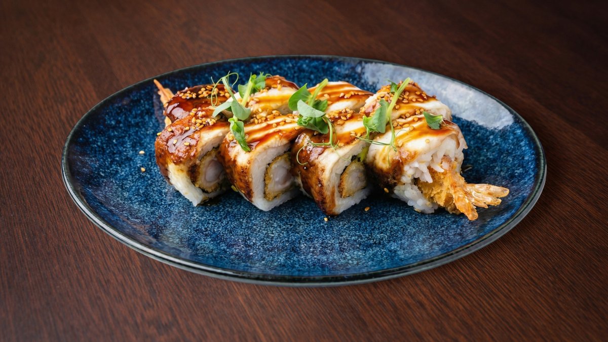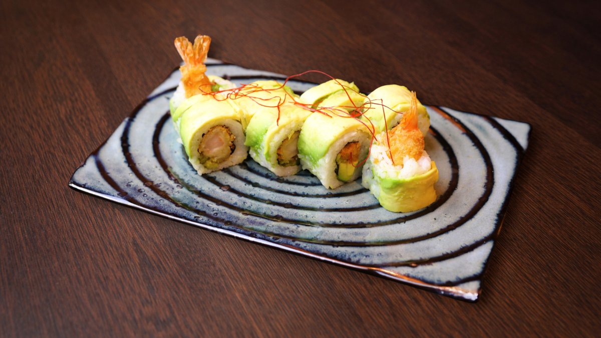 Rīsi, tempura garnele, zutis, avokado, ingvers, vasabi, mikrozaļumi