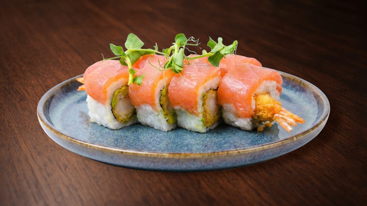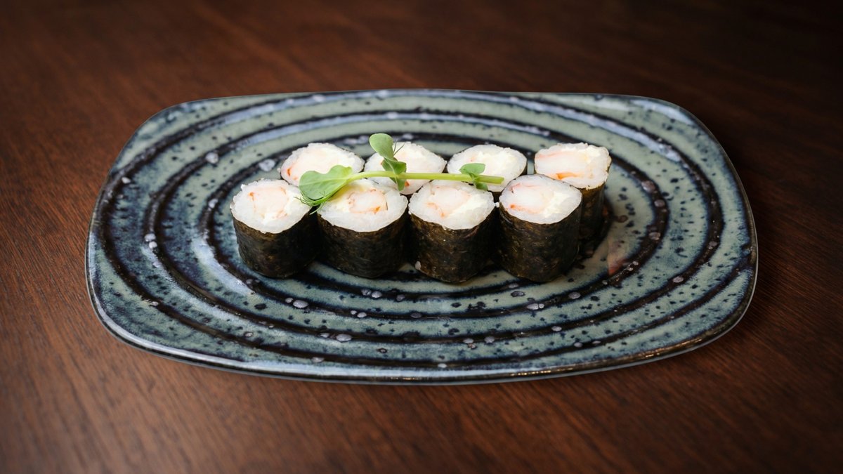Rīsi, tempura garnele, avokado, masago ikri, ingvers, vasabi, mikrozaļumi