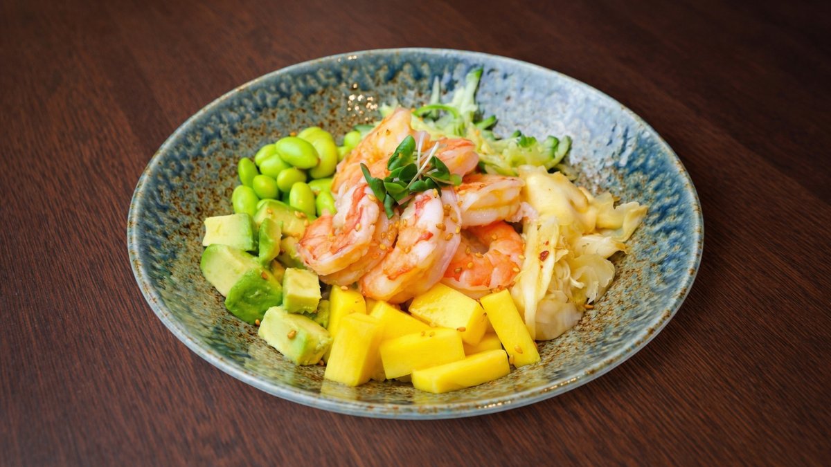 Rīsi, garnele, gurķis, edamame pupiņas, avokado, ingvers, mango, poke mērce, mikrozaļumi