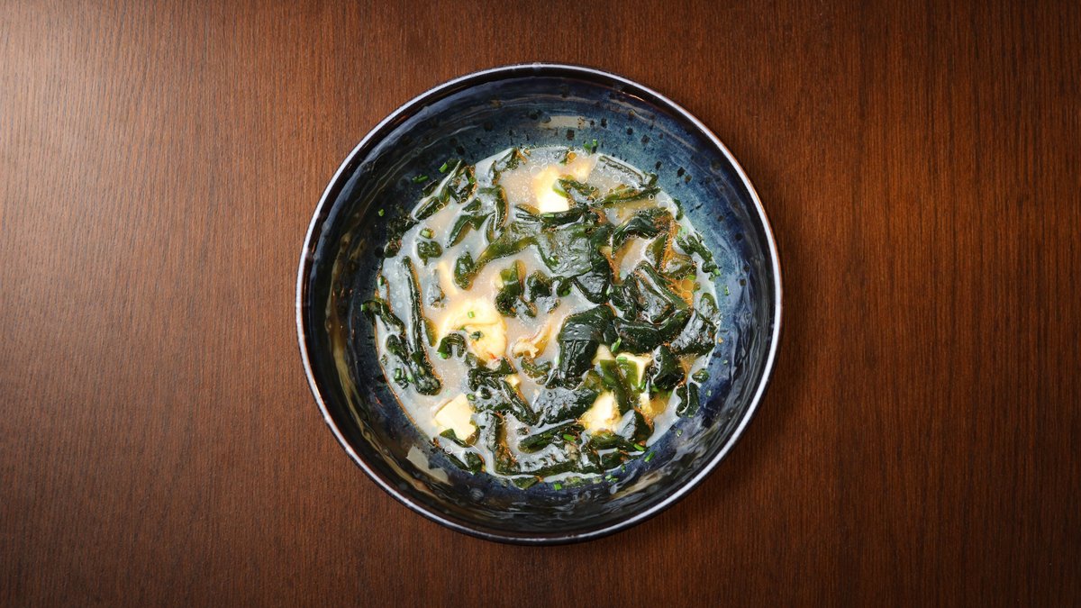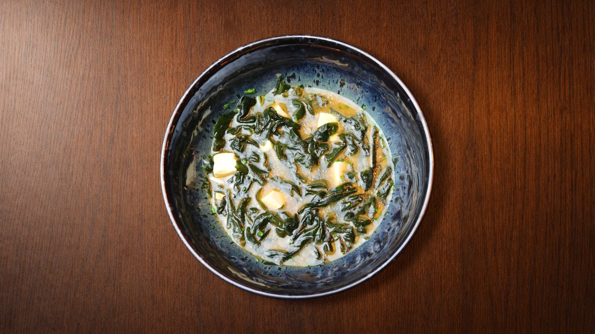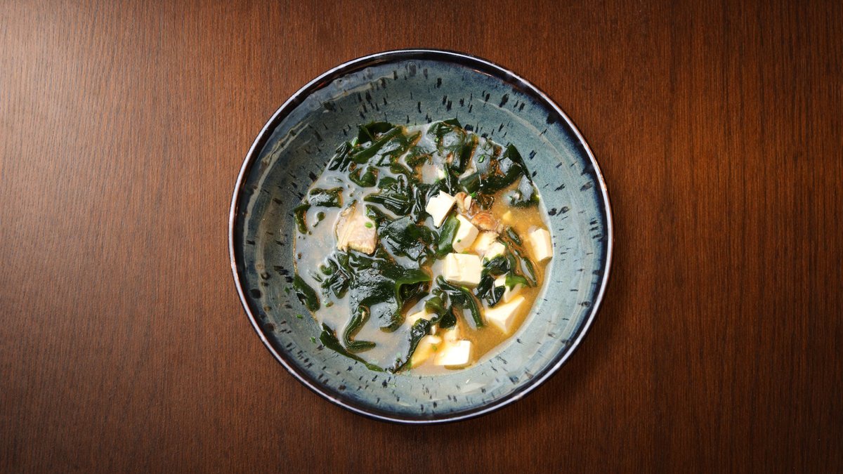 Autora buljons, miso pasta, tofu, kaltētas vakame aļģes, maurlociņi, sezams