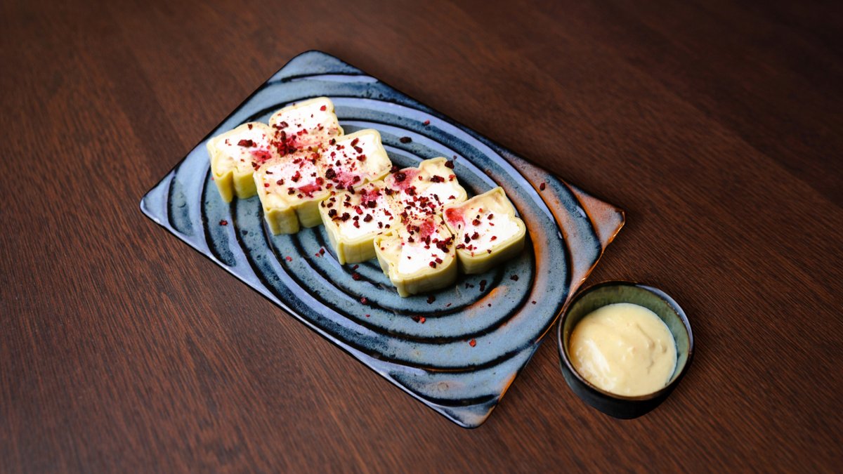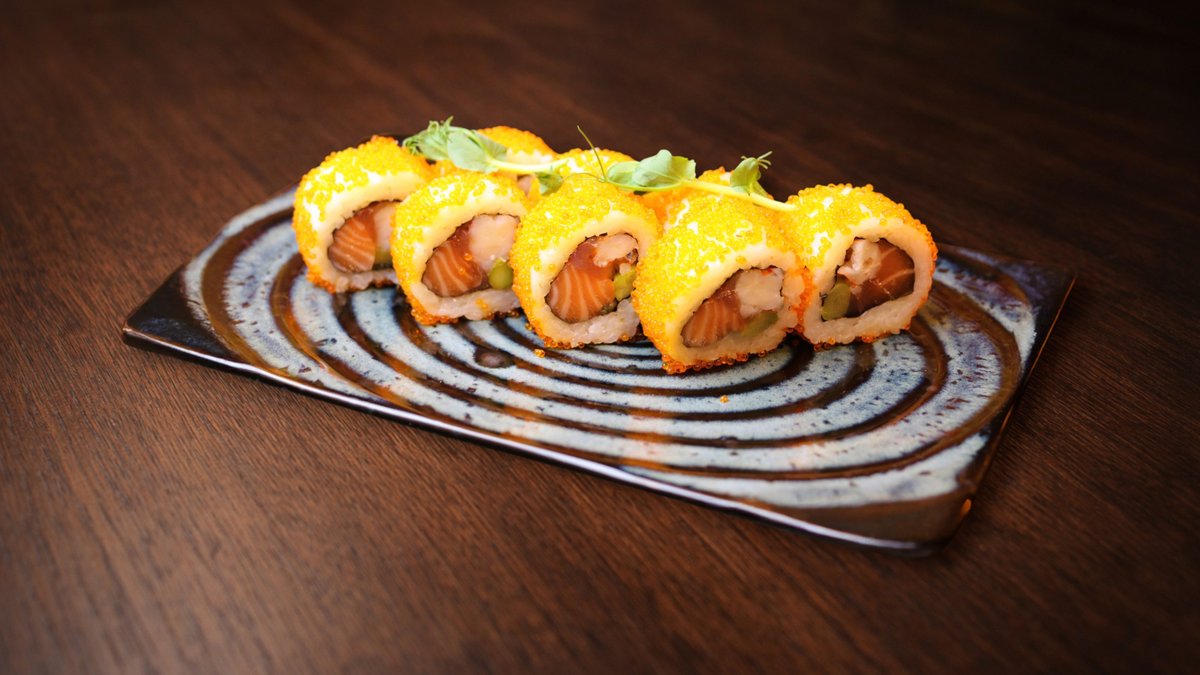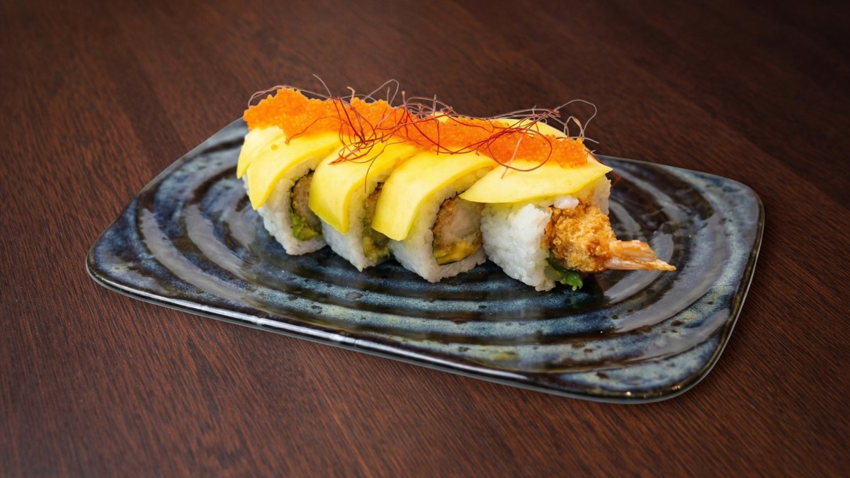 Rīsi, tempura garnele, mango, masago ikri, ingvers, vasabi, mikrozaļumi