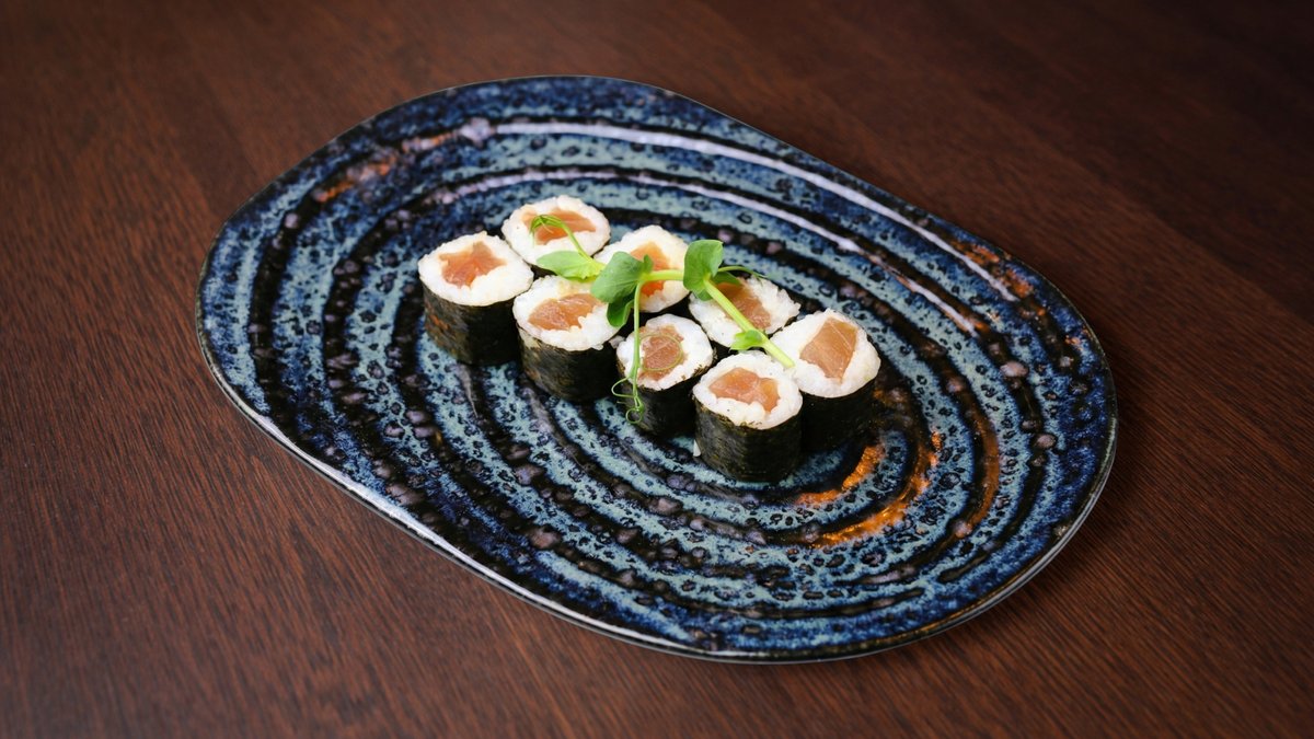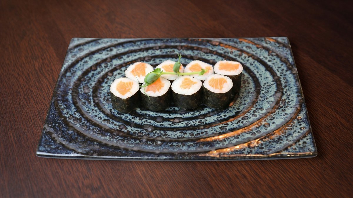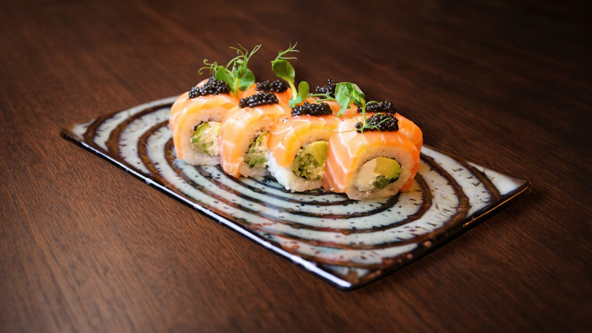 Rīsi, philadelphia siers, gurķis, avokado, svaigs lasis, melnie ikri, ingvers, vasabi, mikrozaļumi