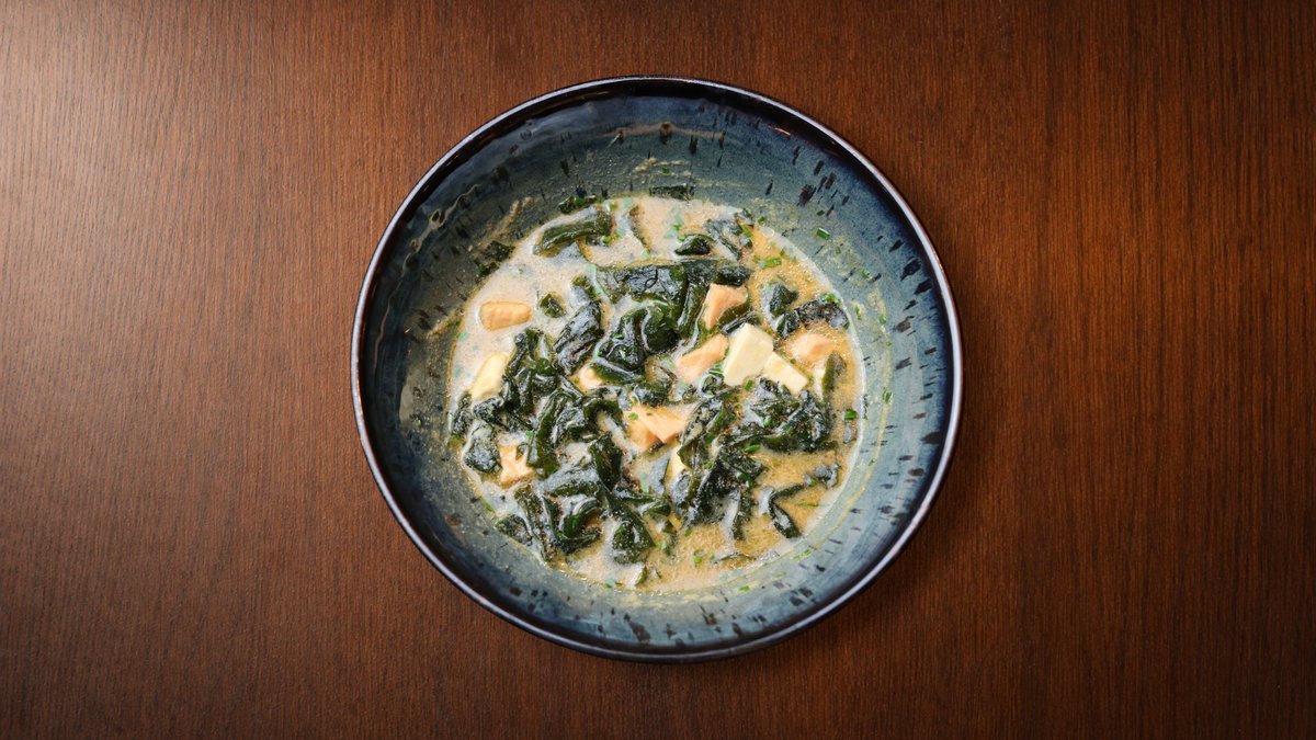 Autora buljons, miso pasta, tofu, svaigs lasis, kaltētas vakame aļģes, maurlociņi, sezams