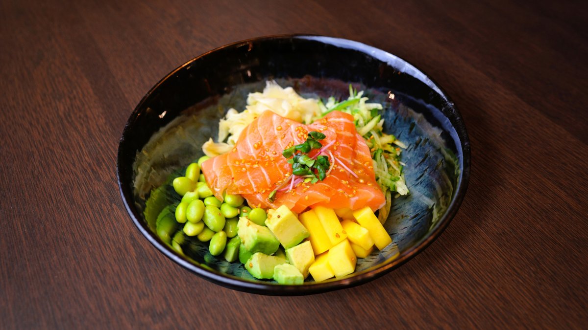 Rīsi, svaigs lasis, gurķis, edamame pupiņas, avokado, mango, poke mērce, mikrozaļumi