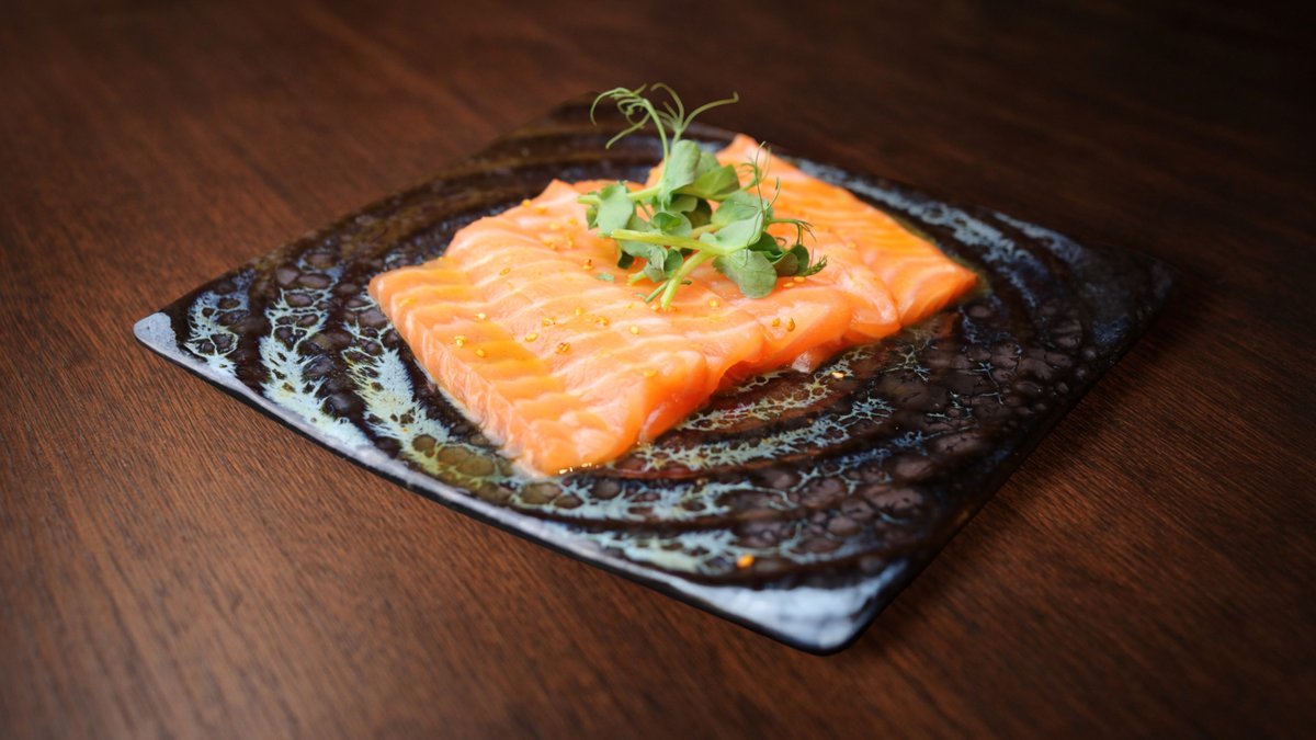 Svaigs lasis, tiradito mērce, kimči, sezams, maurlociņi, ingvers, vasabi