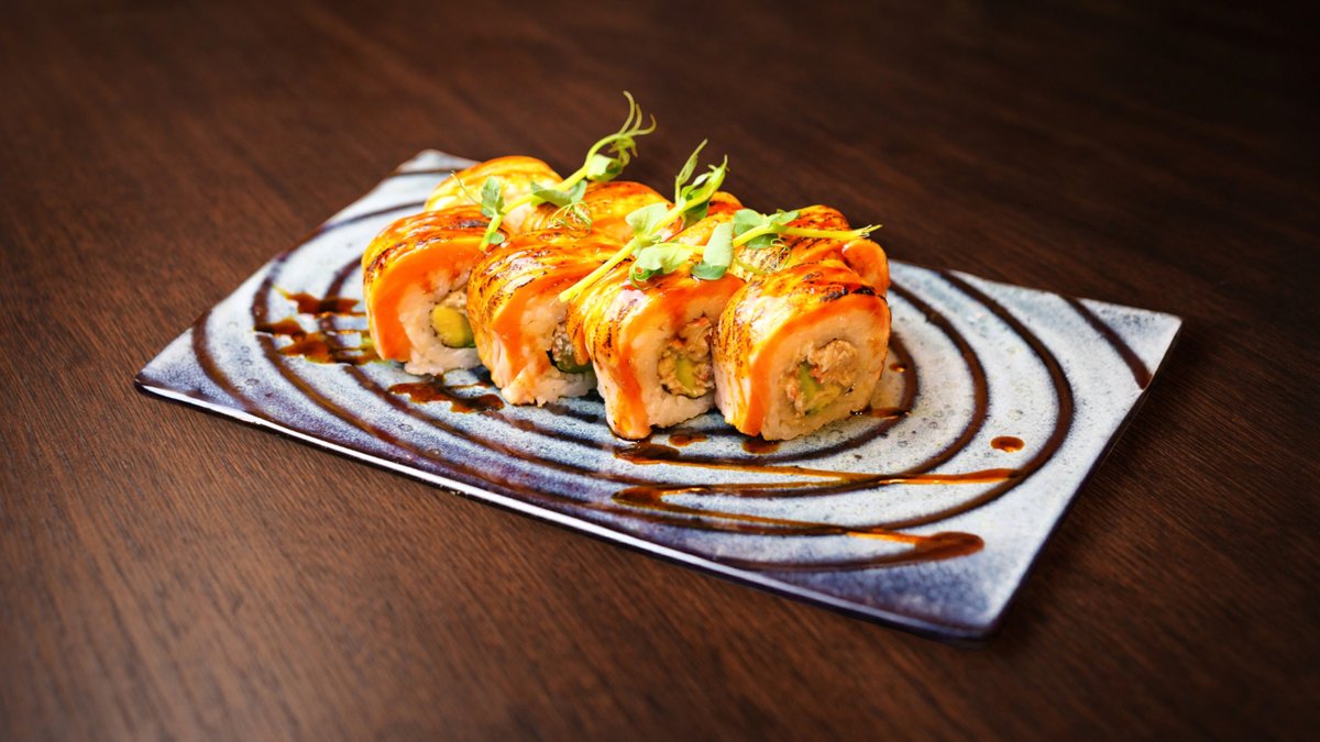 Rīsi, trifeļu krabis, avokado, apdedzināts lasis, unagi mērce, ingvers, vasabi, mikrozaļumi