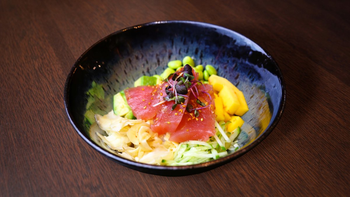 Rīsi, svaigs tuncis, gurķis, edamame pupiņas, avokado, ingvers, mango, poke mērce, mikrozaļumi