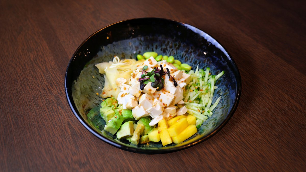 Rīsi, tofu, svaigs gurķis, edamame pupiņas, avokado, mango, poke mērce, mikrozaļumi