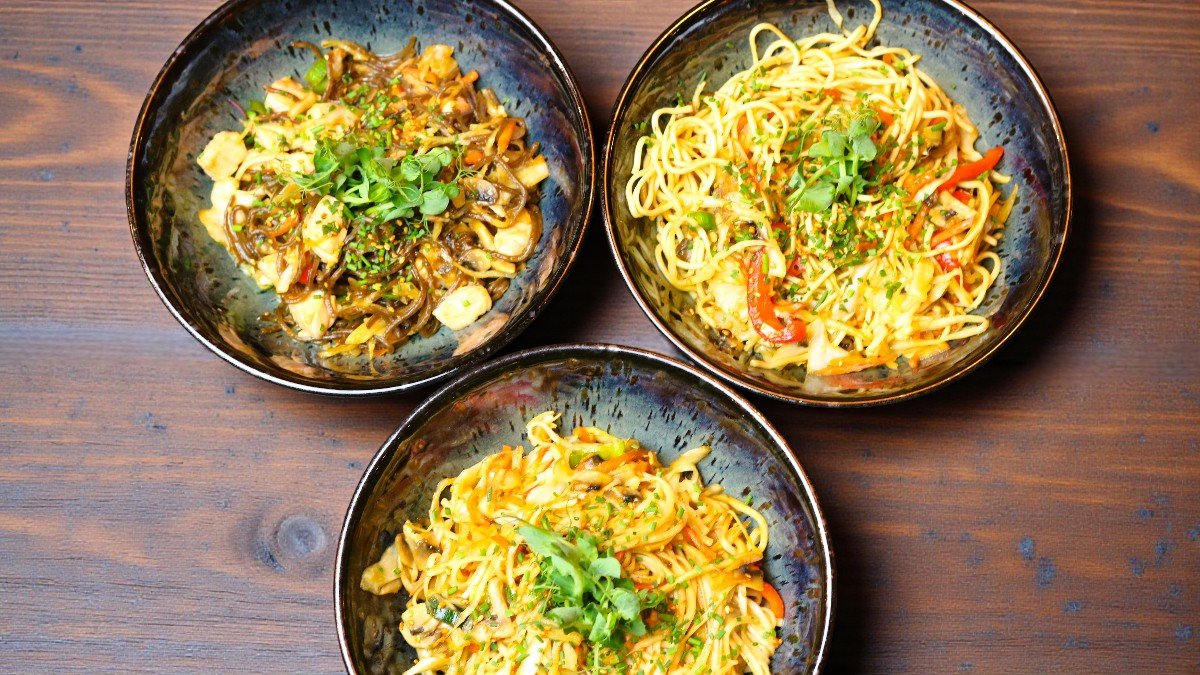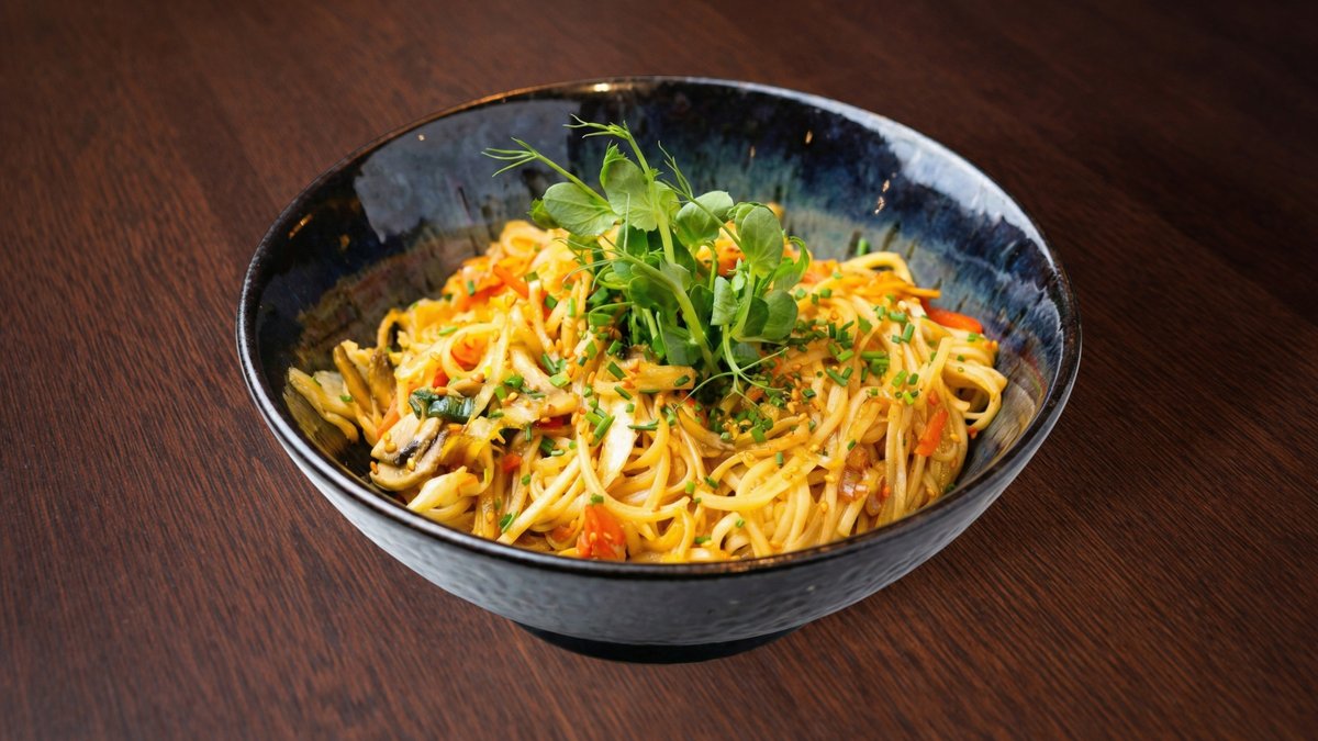 Nūdeles pēc izvēles, wok dārzeņi, šefpavāra mērce, sezams, maurlociņi, mikrozaļumi