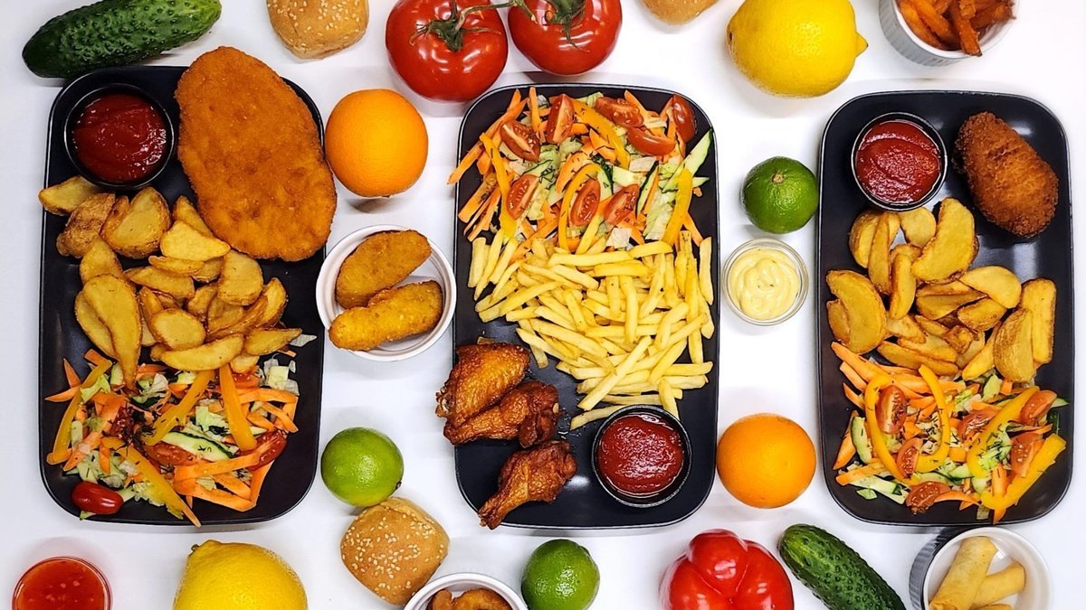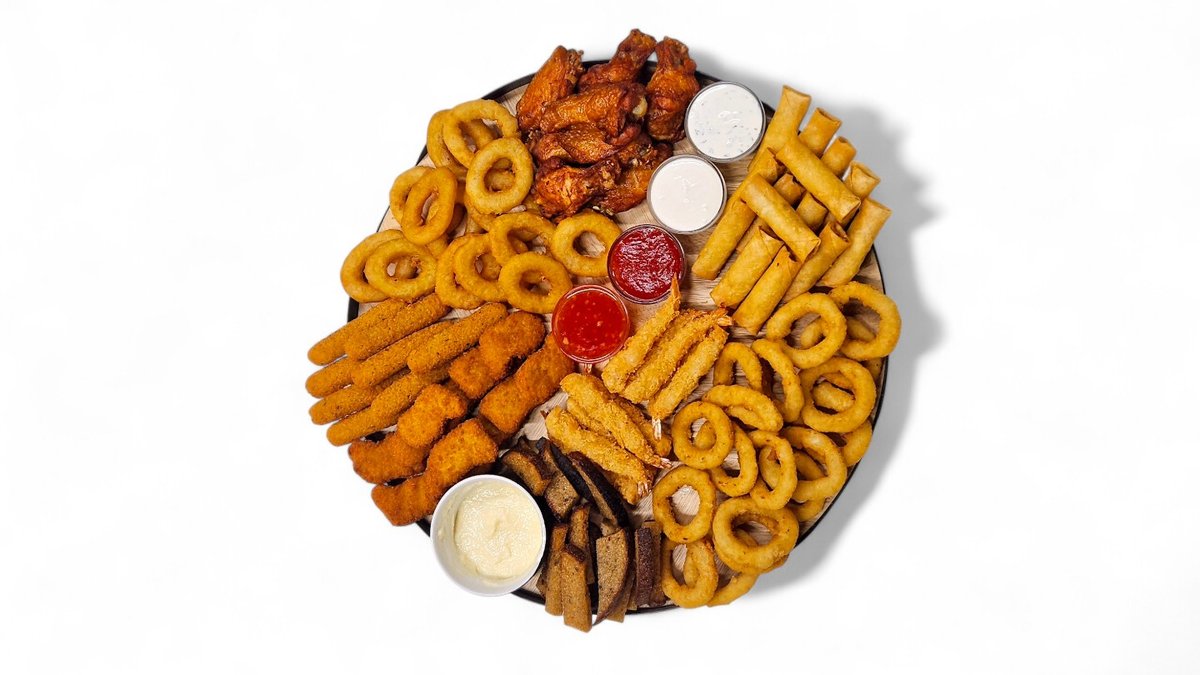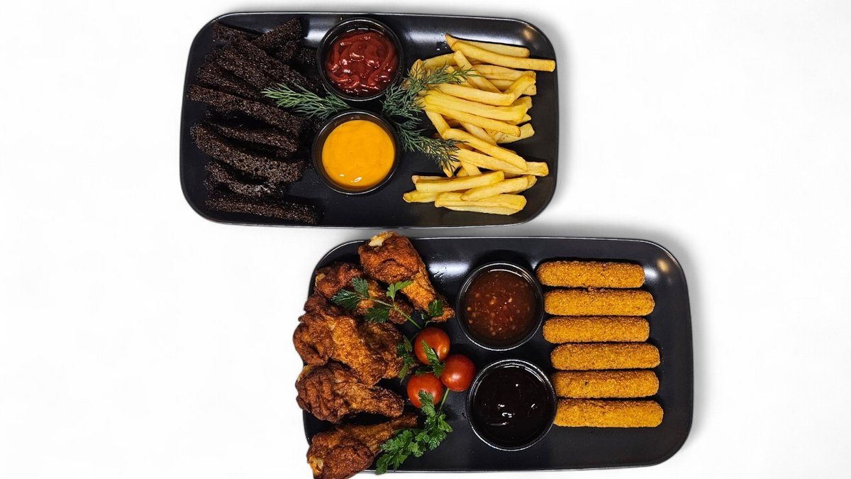 Dienas piedāvājums, burgeri, uzkodas un uzkodu plates.