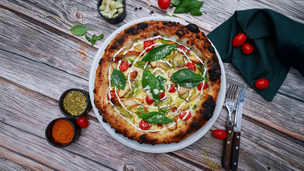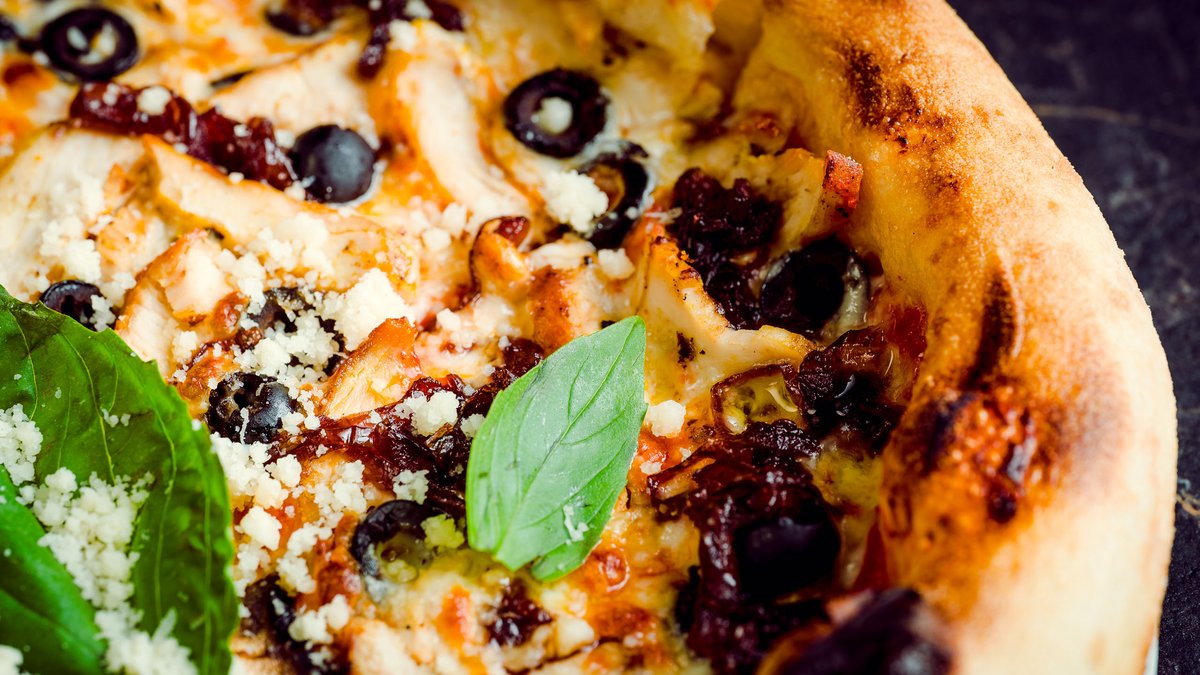 Tomātu mērce ,grilēta vistas krūtiņa,Mocarella,karamelizēti sīpoli,olīvas,Extra Virgin olīveļļa