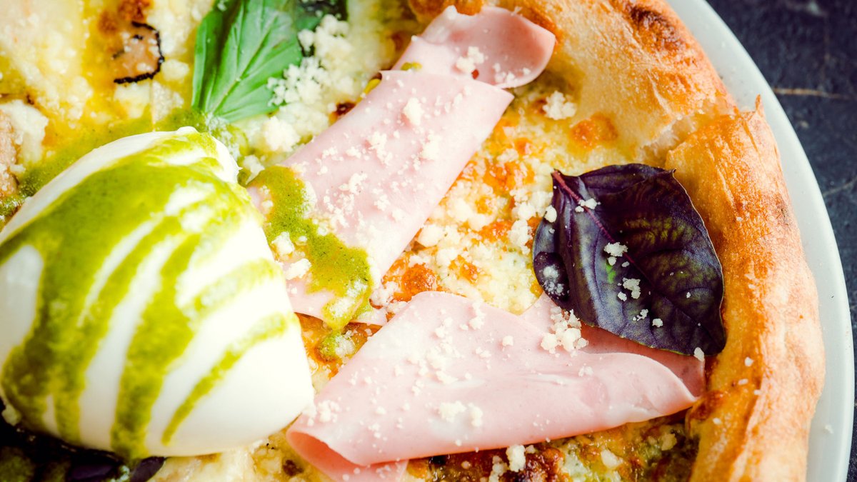 Bazilika pesto,desa Mortadella ar pistācijām,Mozzarella di Bufala siers,Parmegiano Reggiano,Mocarella,Extra Virgin olīveļļa,baziliks