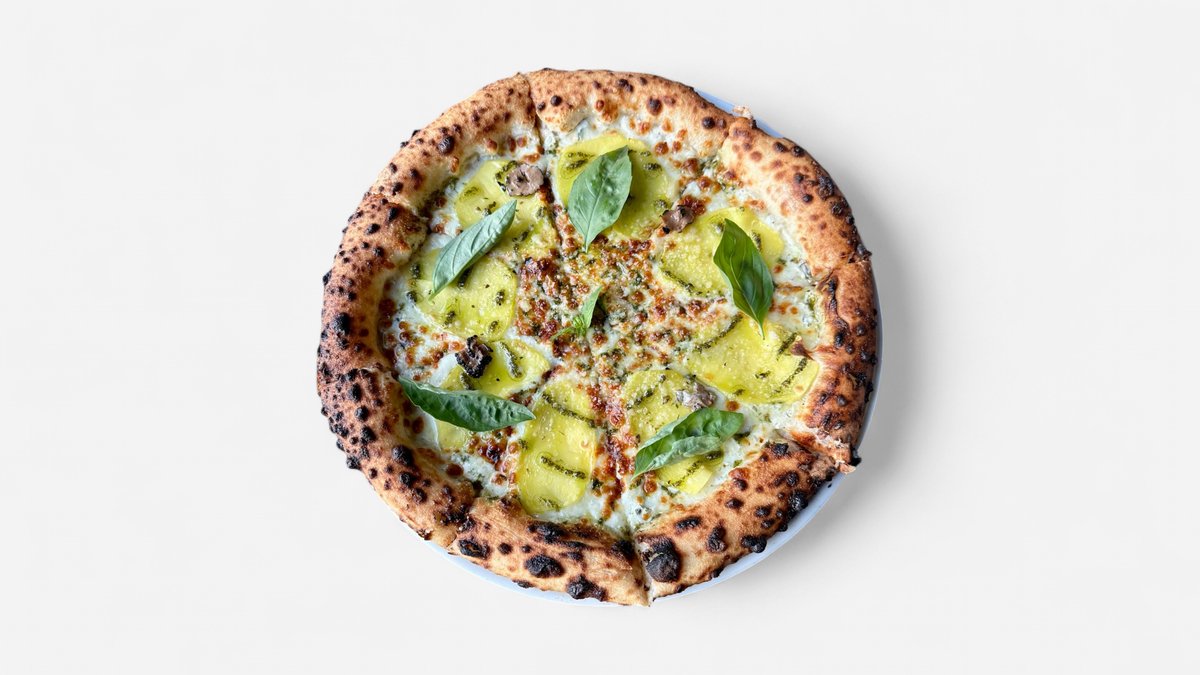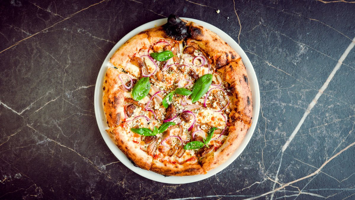 Bezpiedevu jogurts,bazilika pesto,Mocarella,cietais siers,šampinjoni, karamelizēti sīpoli